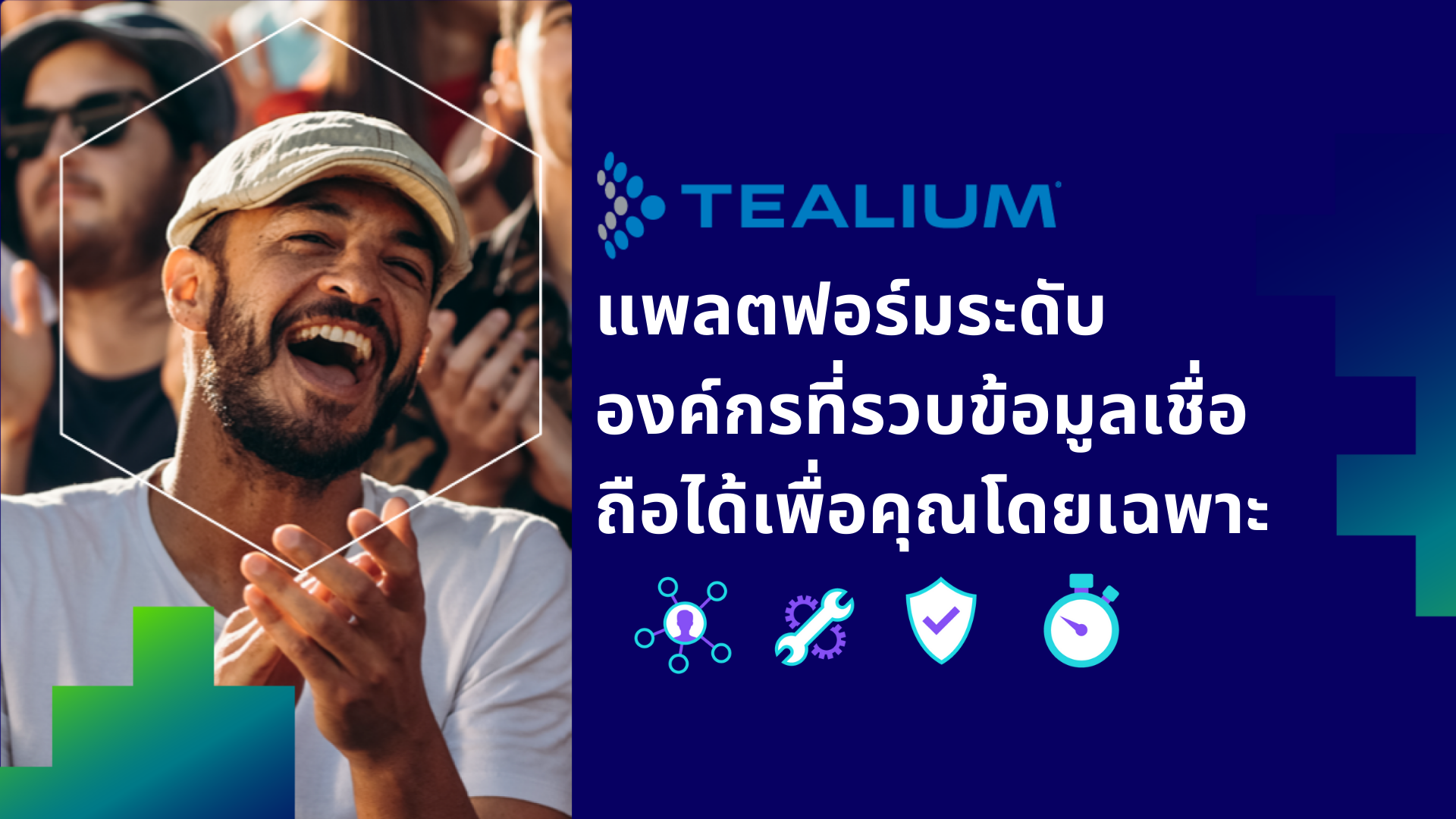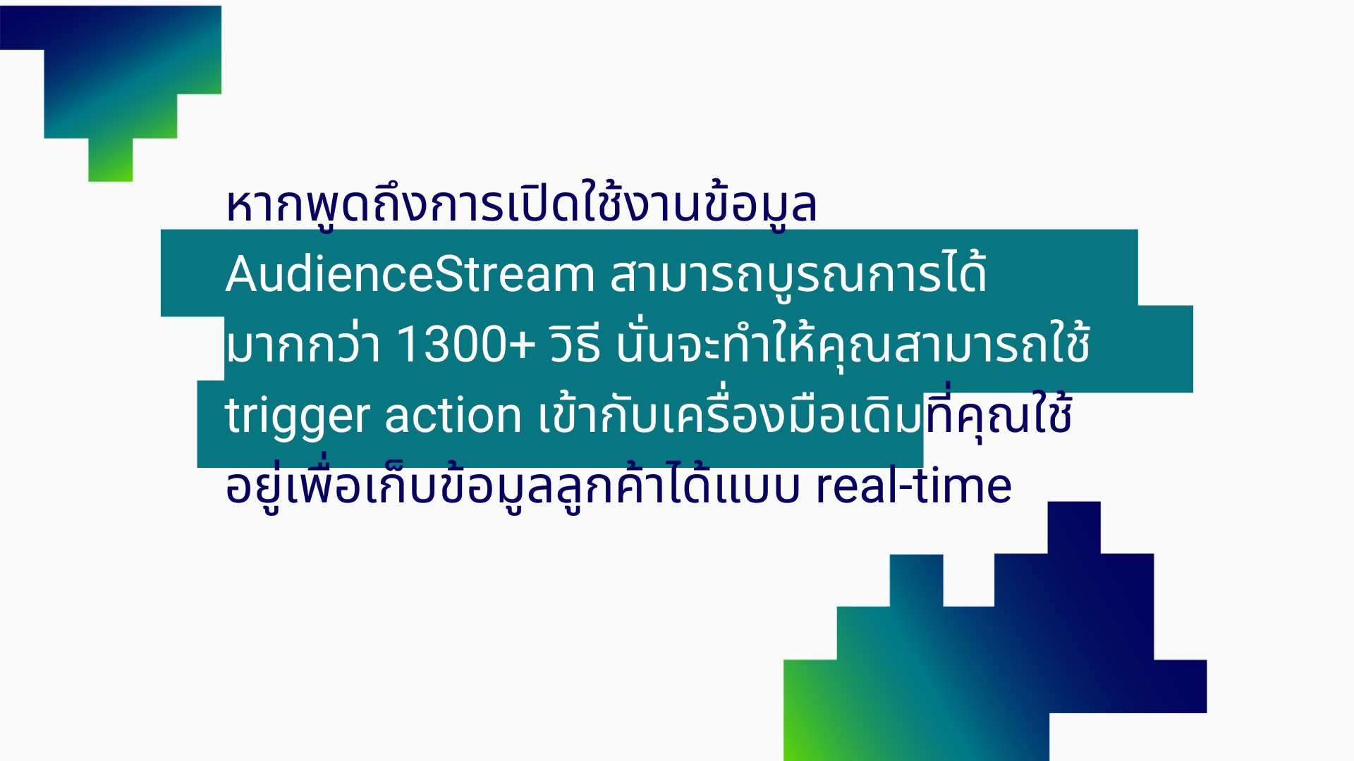 Tealium AudienceStream ถูกออกแบบมาเพื่อการนี้ ฟีเจอร์นี้จะทำให้คุณเห็นภาพกว้างของลูกค้าอีกทั้งยังสามารถปรับแต่งได้ตามที่ต้องการ และสามารถนำไปใช้ได้ทันทีขึ้นตามแต่กฎของธุรกิจได้จำกัดไว้ AudienceStream สามารถบูรณการได้มากกว่า 1300+ วิธี นั่นจะทำให้คุณสามารถใช้ trigger action เข้ากับเครื่องมือเดิมที่คุณใช้อยู่เพื่อเก็บข้อมูลลูกค้าได้แบบ real-time