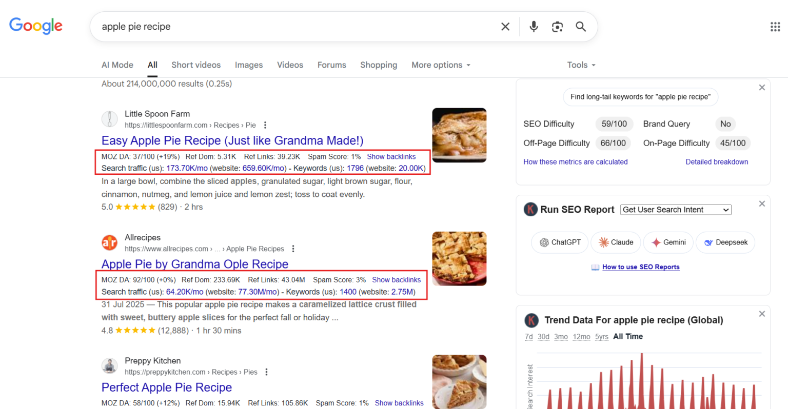 - แสดงค่า Domain Authority (DA), backlinks และข้อมูลทราฟฟิกได้ทันทีใน Google