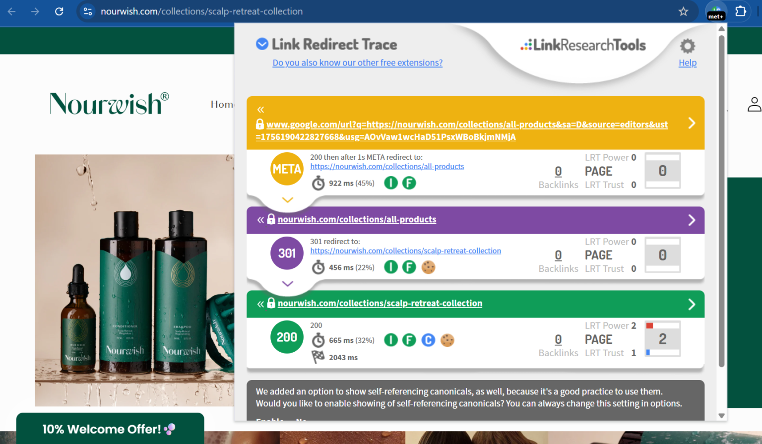 แสดงเส้นทางการ redirect แบบเต็มของหน้าเว็บ (เช่น 301, 302, meta refresh, JavaScript redirects) สำหรับเวอร์ชันฟรี ยังสามารถตรวจสอบ header ของโปรโตคอล, แท็ก rel=canonical และไฟล์ robots.txt ได้ด้วย