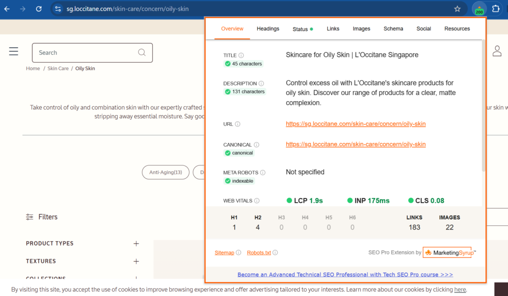 SEO Pro ช่วยให้คุณเห็นข้อมูลเชิงลึกขององค์ประกอบบนหน้าเว็บ เช่น ชื่อเรื่อง (title), คำอธิบายเมตา (meta description), หัวข้อ (headers) และลิงก์ภายในเว็บไซต์ ได้อย่างรวดเร็วโดยไม่ต้องเข้าไปดู source code