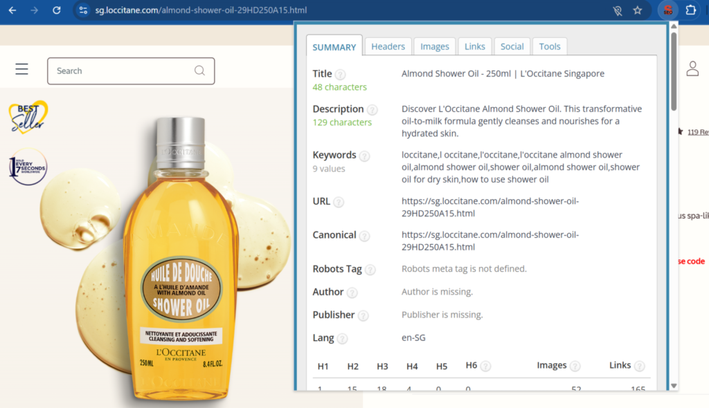 เครื่องมือนี้คล้ายกับ SEO Pro Extension แสดงข้อมูล SEO ที่สำคัญทั้งหมดบนหน้าเว็บใด ๆ ได้ในคลิกเดียว รวมถึงชื่อเรื่อง (title), คำอธิบาย (description), แท็ก robots, หัวข้อ (headers) และรูปภาพ