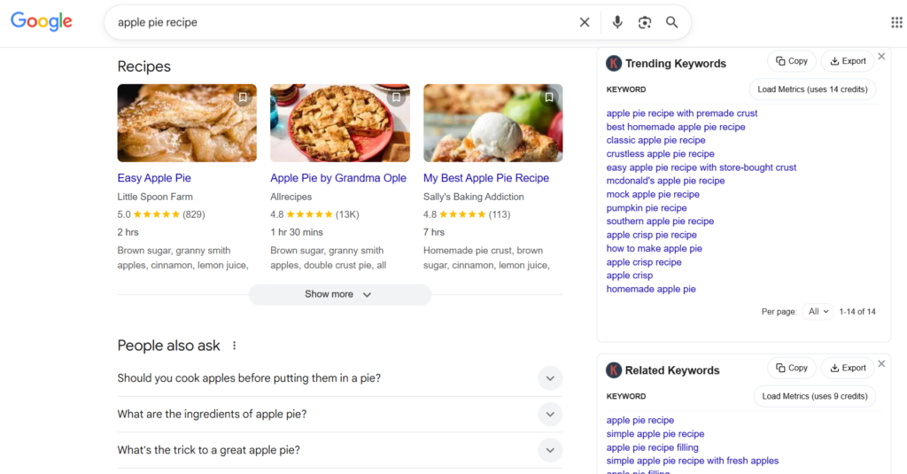 Another keyword research tool that not only shows estimated search volume but also highlights the number of keywords used on a page and how often your target keyword appears in the competitors’ content. It also provides a list of related keyword suggestions directly within Google search results
