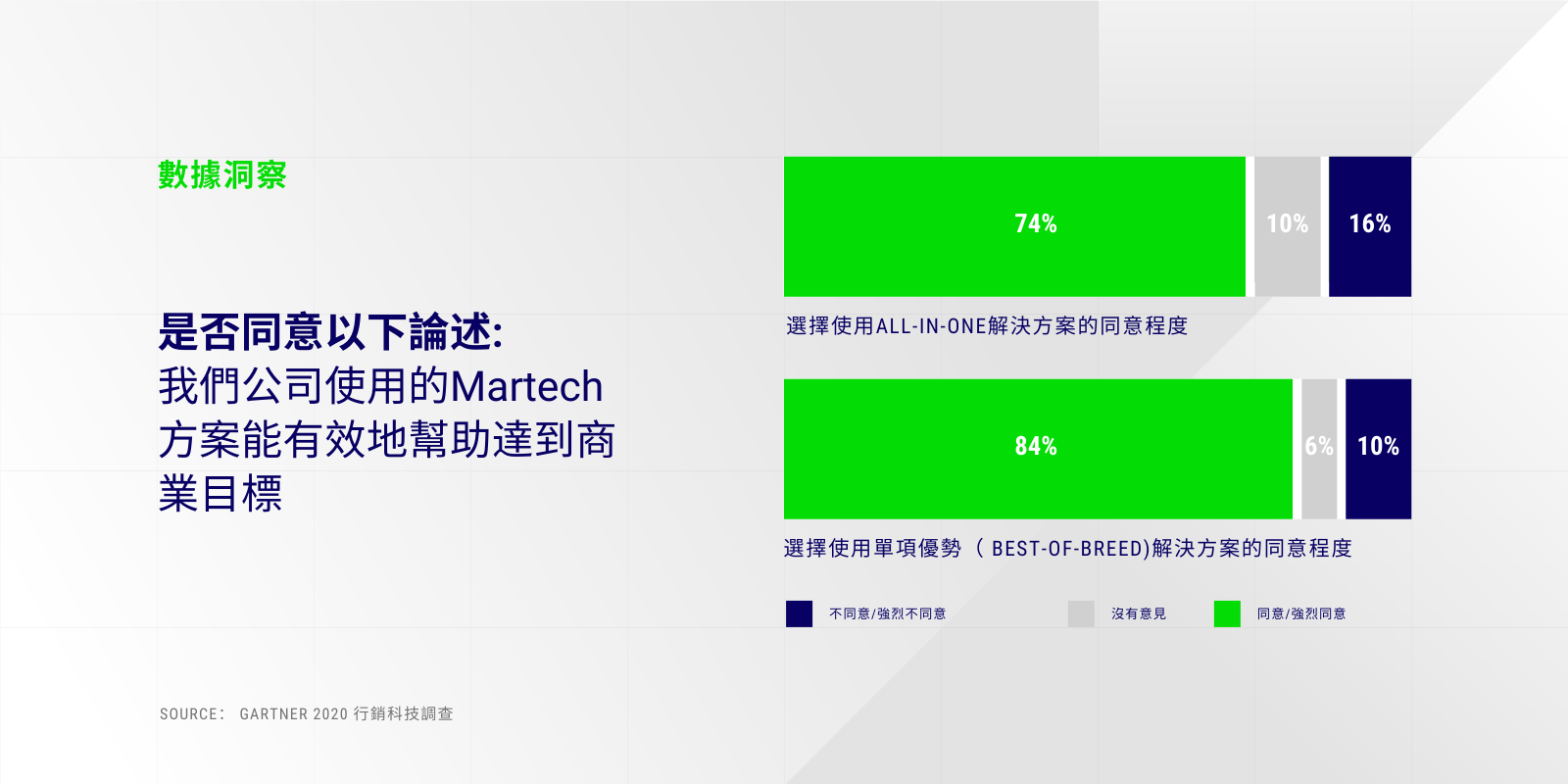 另一方面,購買整包綑綁的方案也導致預算未能最有效被利用 – 在整包的方案中,許多功能往往最後沒有被使用。Garnter的行銷科技報告指出,84%使用best-of-breed的行銷人員認為他們的行銷科技方案能夠有效幫助達到商業目標,比使用all-in-one足足高出10個百分比。