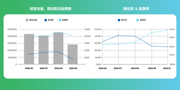 比較 2023 年 8 月和 9 月,Leflair 發送了不到 300 萬封的郵件,總發信量減少 38%,開信率也相對減少 59%。由於發送更精準的目標受眾,不僅讓點擊率提升,同時也省下 35.29% 的成本。我們知道 Hi-iQ 能有效發揮作用是因為不重複點擊次數有維持在一定水平上,儘管總發信量減少。整體來說,Hi-iQ 協助 Leflair 減少成本並同時保持成效,讓電子郵件成為能獲得穩定營收的渠道,有效提升投資回報率。