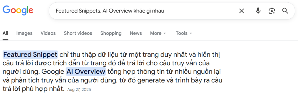 | Kết quả hiển thị | Danh sách liên kết | Câu trả lời trực tiếp trên SERP hoặc AI chat, có thể kèm trích dẫn, AI Overview, Voice result |