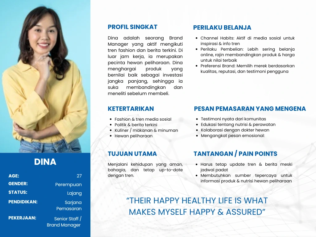 Persona ini menggambarkan siapa pelanggan kamu—mulai dari usia, pekerjaan, hingga apa yang pelanggan kamu cari dalam hidup.