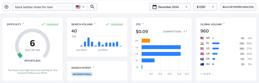 - Lower Competition: Long-tail keywords generally face less competition compared to generic, short-tail keywords. This makes them ideal for small businesses or new websites trying to gain visibility. For instance, while ranking for “shoes” might take years, “black leather shoes for men” is much more achievable. Lower competition also means fewer resources are needed to achieve impactful results.