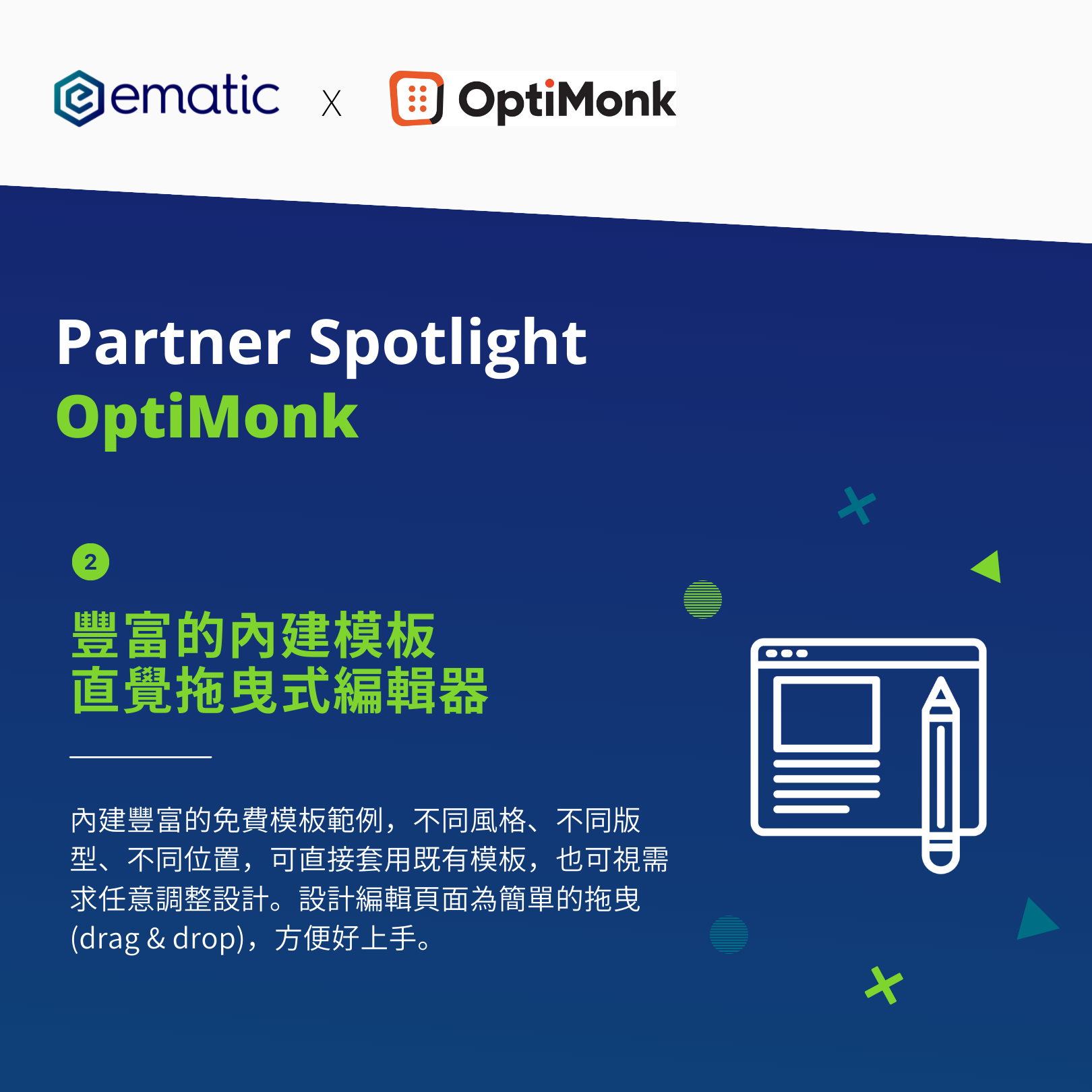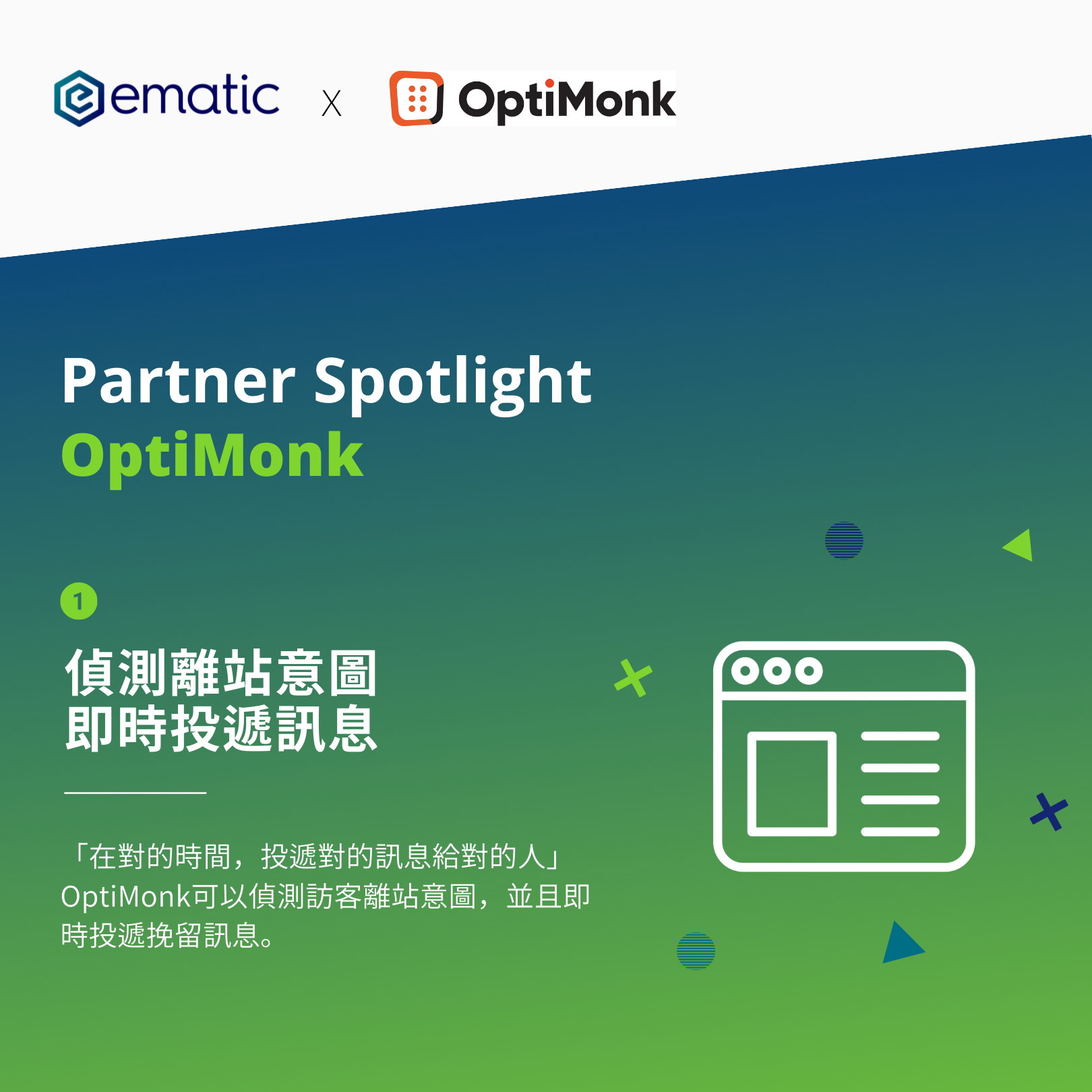 OptiMonk 是一款方便又容易上手的智慧型多功能蓋板工具,在 2014 年創辦於歐洲。Ematic 之所以選擇與 Optimonk 建立合作關係,就是因為 Optimonk 的主打:「在對的時間、向對的人,投遞對的訊息」。