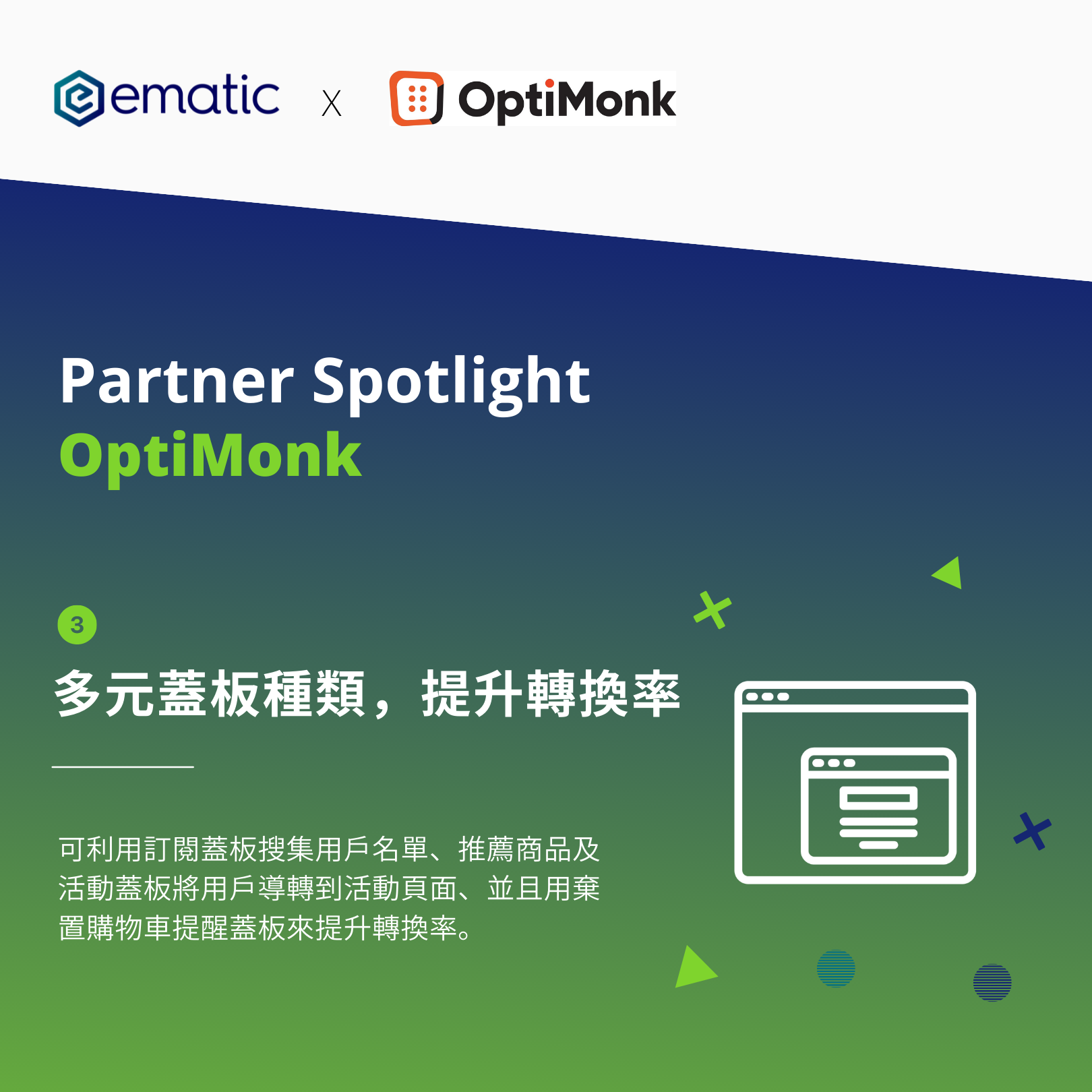 若是想搜集使用者名單、提升網站轉換率,那麼不防考慮看 OptiMonk:https://www.ematicsolutions.com/tw/partners/optimonk/