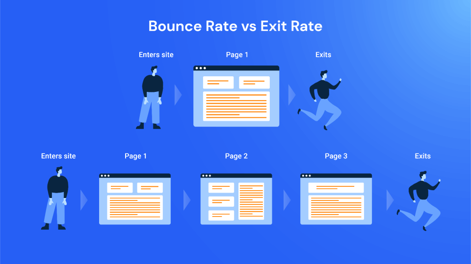| Công thức tính | (Số phiên chỉ truy cập một trang / Tổng số phiên bắt đầu từ trang đó) × 100% | (Số phiên thoát khỏi trang / Tổng số lượt xem của trang) × 100% |